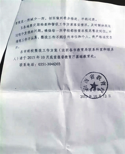 山西省教育廳基礎教育處一名工作人員向新京報記者確認,上述文件由省廳于2015年10月12日下發(fā),具有行政效力。