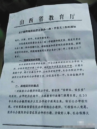 新京報記者看到,文件名為《關(guān)于清理規(guī)范民營企業(yè)辦(助)學有關(guān)工作的通知》,加蓋有山西省教育廳公章。文件中明確提出,“在2-3年內(nèi)將公辦教師逐步從民辦學校中剝離岀來,轉(zhuǎn)回公辦學校任職。”