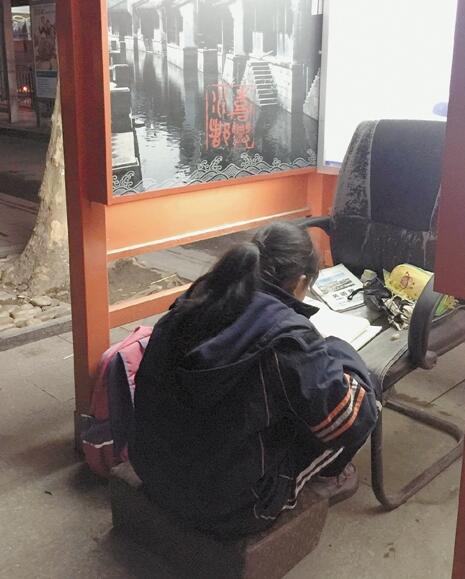 照片上這個四面漏風(fēng)的電話亭,是嘉興12歲女孩曉華的“書房”,一把舊椅子當(dāng)書桌,沙發(fā)坐墊當(dāng)?shù)首樱刻旖柚璋档恼彰鳠艨磿鲎鳂I(yè)。