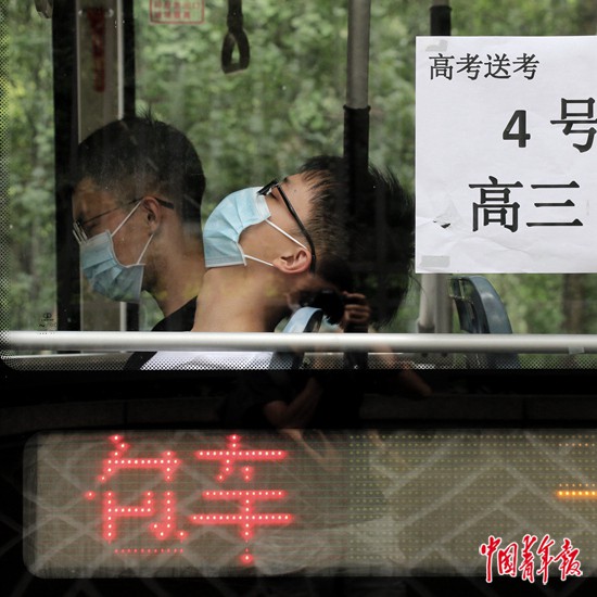 7月7日上午,四川省成都市,剛剛參加完高考語文考試的一位考生坐在車上閉目養(yǎng)神。由于考點不在本校,這位學(xué)生所在的學(xué)校安排了專車接送考生。中青報·中青網(wǎng)記者 王鑫昕/攝