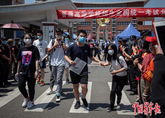 7月7日上午,北京市豐臺區(qū),北京市第十二中學(xué)考點,結(jié)束上午的考試后,高考考生們走出考場,一位考生從人群中牽起家人的手。當(dāng)天是2020年全國統(tǒng)一高考第一天,據(jù)了解,今年北京市高考在7月7日至10日舉行,共49000多名考生,設(shè)17個考區(qū),132個考點學(xué)校,2867個考場,每考場考生人數(shù)由過去的30人減至20人。中青報·中青網(wǎng)記者 李崢苨/攝