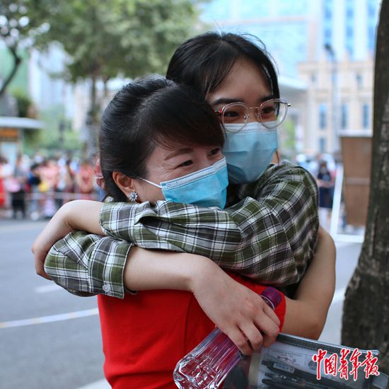 7月7日上午,四川省成都市,成都七中考點門口,一名考生進(jìn)入考場前與老師擁抱。汪龍華/攝