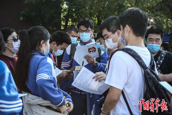 7月7日上午,北京市中國人民大學(xué)附屬中學(xué)朝陽學(xué)校(東校區(qū))門口,考生們在進(jìn)入考場前抓緊時間看復(fù)習(xí)資料。中青報·中青網(wǎng)見習(xí)記者 孔斯琪/攝