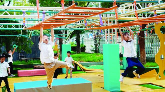 常州市五星幼兒園的負(fù)責(zé)人王艷表示,有一次同事將幾條外國(guó)幼兒園、小學(xué)低年級(jí)年齡段孩子進(jìn)行體能訓(xùn)練的視頻發(fā)了過(guò)來(lái),視頻上的孩子能夠完成跳鞍馬、手倒立行走等動(dòng)作?!坝谑?,我們結(jié)合孩子們的意見(jiàn),邀請(qǐng)專家共同繪制賽道構(gòu)思圖,將平衡、走、跑、跳、攀爬、懸掛等動(dòng)作元素融為一體,打造出一個(gè)綜合性的體能游戲賽道?!?/p>
