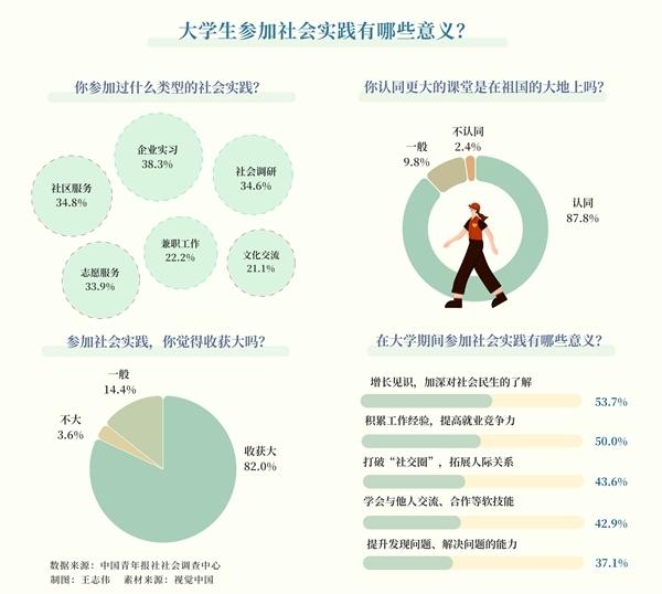 參與實地調研,開展支教服務,進入企業(yè)實習……這個夏天,不少大學生選擇用社會實踐作為暑假的打開方式。日前,中國青年報社社會調查中心聯(lián)合問卷網(wǎng)(wenjuan.com)發(fā)布的一項有1000名大學生參與的調查顯示,82.0%的受訪大學生認為參加暑期社會實踐收獲大。對于參加社會實踐的意義,53.7%的受訪大學生認為能增長見識,加深對社會民生的了解,50.0%的受訪大學生認為能積累工作經(jīng)驗,提高就業(yè)競爭力。87.8%的受訪大學生認同,更大的課堂是在祖國的大地上。