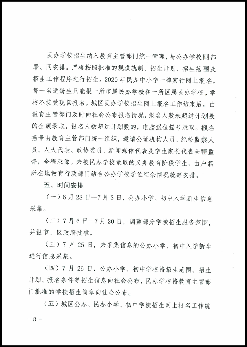 民辦學(xué)校招生納入教育主管部門統(tǒng)一管理與公辦學(xué)校同部署、同安排。嚴(yán)格按照批準(zhǔn)的規(guī)模軌制、招生計(jì)劃、招生范圍及招生工作程序進(jìn)行招生。2020年民辦中小學(xué)一律實(shí)行網(wǎng)上報(bào)名,每一名適齡生只能報(bào)一所市屬民辦學(xué)校和一所區(qū)屬民辦學(xué)校,學(xué)校不接受現(xiàn)場報(bào)名。