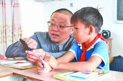 張海波(左)正在教學生合理使用手機。資料圖片