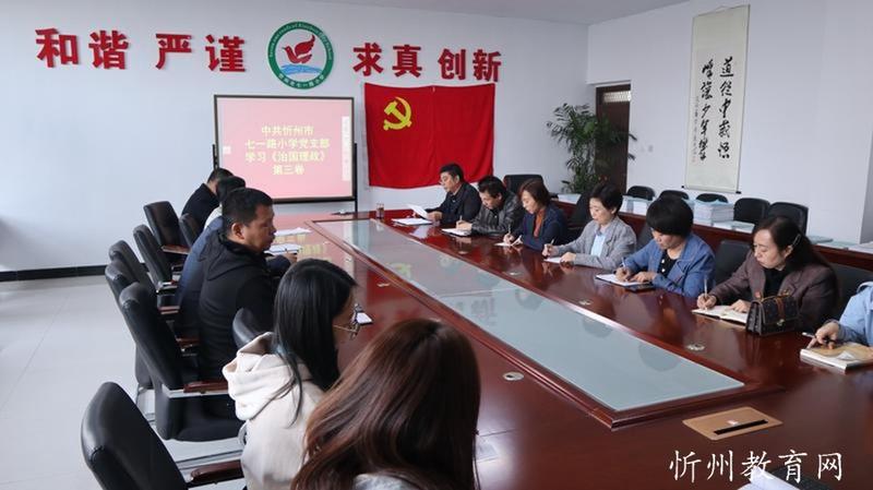 忻州市七一路小學(xué)網(wǎng)訊:10月19日,中共忻州市七一路小學(xué)黨支部專題學(xué)習(xí)《習(xí)近平談治國(guó)理政》第三卷。黨支部書記靳茂文作專題報(bào)告,全體黨員參加了會(huì)議,會(huì)議由黨辦主任史小榮主持。