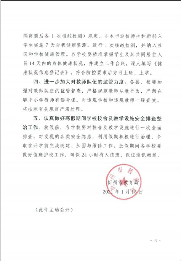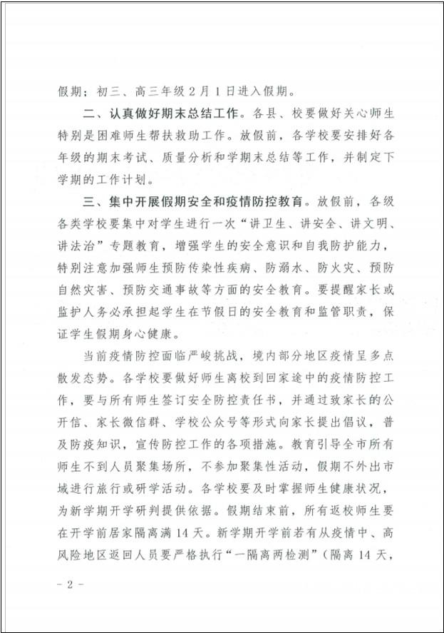 根據(jù)省、市疫情防控工作領導小組及省教育廳視頻會議精神和我市新冠疫情防控最新形勢,為保障全市師生生命安全和身體健康;經(jīng)市委、市政府同意,現(xiàn)將2021年寒假及假期前后工作安排如下,請遵照執(zhí)行。