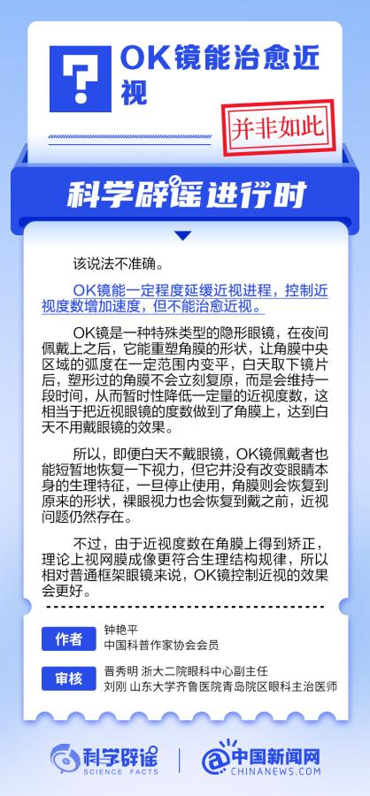 OK鏡能一定程度延緩近視進(jìn)程,控制近視度數(shù)增加速度,但不能治愈近視。OK鏡是一種特殊類型的隱形眼鏡,在夜間佩戴上之后,它能重塑角膜的形狀,讓角膜中央?yún)^(qū)域的弧度在一定范圍內(nèi)變平,白天取下鏡片后,塑形過(guò)的角膜不會(huì)立刻復(fù)原,而是會(huì)維持一段時(shí)間,從而暫時(shí)性降低一定量的近視度數(shù)。但它并沒有改變眼睛本身的生理特征,一旦停止使用,角膜則會(huì)恢復(fù)到原來(lái)的形狀,裸眼視力也會(huì)恢復(fù)到戴之前。(來(lái)源:@科學(xué)辟謠中國(guó)新聞網(wǎng)微博 )