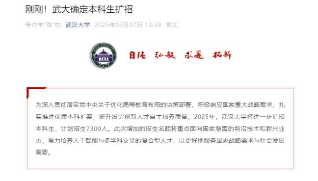 3月7日,據武漢大學微信公眾號消息,為深入貫徹落實黨中央關于優(yōu)化高等教育布局的決策部署,積極響應國家重大戰(zhàn)略需求,扎實推進優(yōu)質本科擴容,提升拔尖創(chuàng)新人才自主培養(yǎng)質量,2025年,武漢大學將進一步擴招本科生,計劃招生7300人。此次增加的招生名額將重點面向國家急需的前沿技術和新興業(yè)態(tài),著力培養(yǎng)人工智能與多學科交叉的復合型人才,以更好地服務國家戰(zhàn)略需求與社會發(fā)展需要。