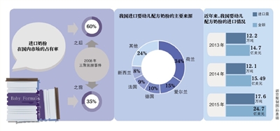今年2月,中國海關發(fā)布的數(shù)據顯示,2015年我國進口嬰幼兒配方奶粉達到17.6萬噸,較2014年的12.1萬噸增加5.5萬噸,同比增長45%;進口嬰幼兒配方奶粉的價值達到24.7億美元,同比增長59.5%。