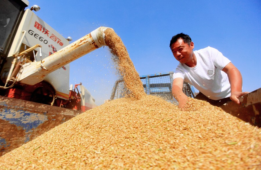 山東省臨沂市平邑縣地方鎮(zhèn)農(nóng)民將收獲的小麥裝車(6月13日攝)。(新華社發(fā),武紀全攝)