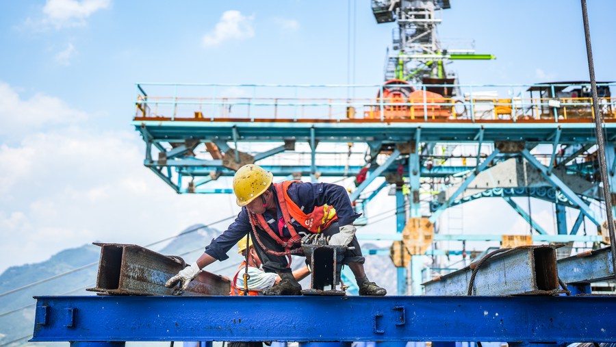 貴州公路集團工人在納晴高速牂牁江大橋施工(6月25日攝)。(新華社記者陶亮攝)