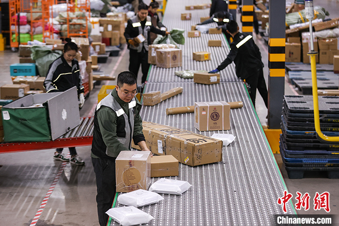 資料圖為2023年11月12日,工作人員在貴州順豐一中轉(zhuǎn)場分揀快遞。中新社記者 瞿宏倫 攝