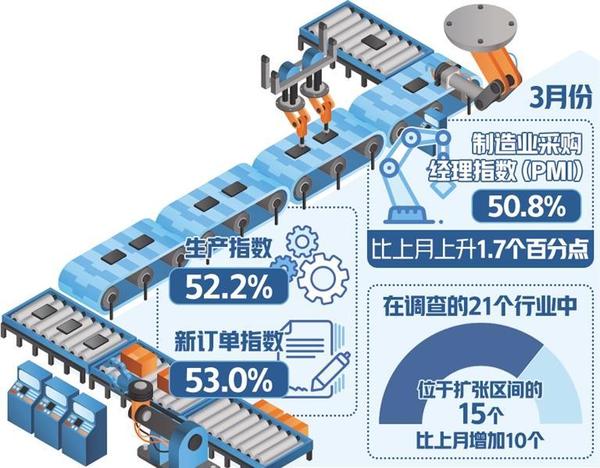 “3月份PMI指數(shù)大幅回升,且重回榮枯線之上,既有季節(jié)性因素影響,也表明經(jīng)濟回升向好態(tài)勢進一步明確。”國務院發(fā)展研究中心研究員張立群表示。
