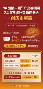 第135屆廣交會(huì)5日在廣州閉幕。自4月15日開幕以來,共有來自215個(gè)國家和地區(qū)的24.6萬名境外采購商線下參會(huì),比上屆增長24.5%,創(chuàng)歷史新高。本屆廣交會(huì)線下出口成交247億美元,線上平臺(tái)出口成交30.3億美元,分別比上屆增長10.7%和33.1%。