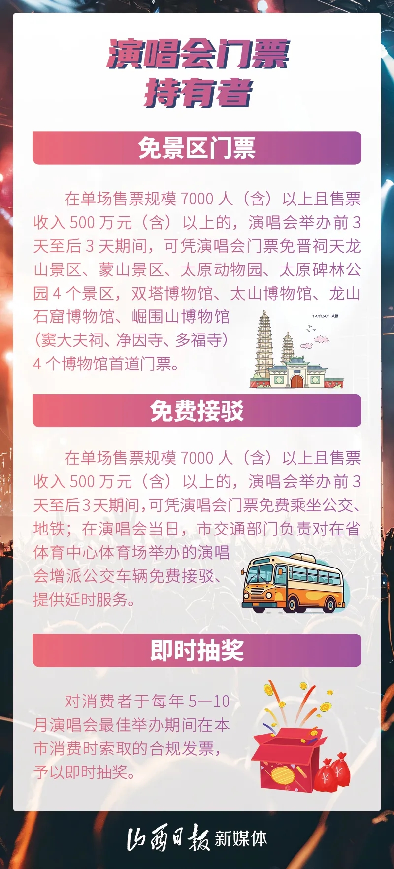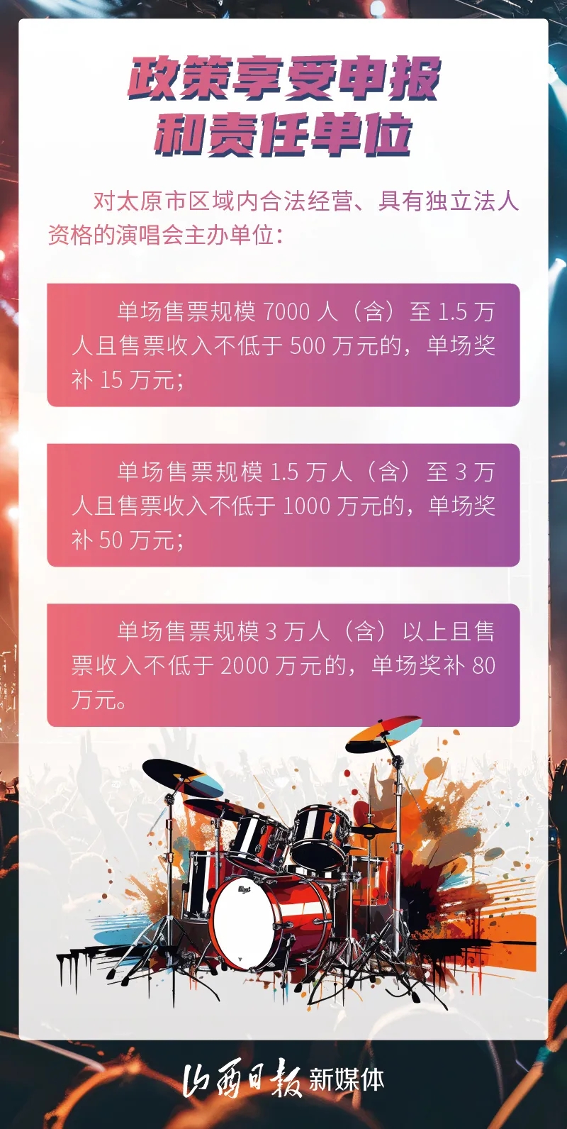 為做大太原市演唱會(huì)經(jīng)濟(jì),加快建設(shè)華北地區(qū)重要演藝中心,打造“國(guó)內(nèi)外重要文化旅游目的地”,日前,太原市發(fā)展和改革委、市文化和旅游局、市財(cái)政局等11個(gè)部門(mén)聯(lián)合制定出臺(tái)《支持演唱會(huì)經(jīng)濟(jì)發(fā)展的若干措施(試行)》。