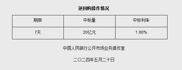 中新網(wǎng)5月20日電 據(jù)中國人民銀行網(wǎng)站消息,為維護銀行體系流動性合理充裕,2024年5月20日人民銀行以利率招標方式開展了20億元逆回購操作。具體情況如下: