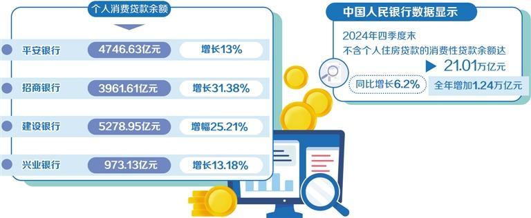 2024年,上市銀行零售業(yè)務(wù)普遍進(jìn)入調(diào)整期,消費(fèi)貸業(yè)務(wù)增長強(qiáng)勁。在擴(kuò)內(nèi)需、促消費(fèi)的背景下,消費(fèi)貸成為零售業(yè)務(wù)的新增長點(diǎn)。中國人民銀行數(shù)據(jù)顯示,2024年四季度末,不含個人住房貸款的消費(fèi)性貸款余額達(dá)21.01萬億元,同比增長6.2%,全年增加1.24萬億元。多家銀行在2024年年報(bào)中披露的個人消費(fèi)貸款數(shù)據(jù)有明顯增長。其中,平安銀行個人消費(fèi)貸款余額4746.63億元,同比增長13%;招商銀行個人消費(fèi)貸款余額3961.61億元,較上年末增長31.38%;中國農(nóng)業(yè)銀行含信用卡在內(nèi)的個人消費(fèi)貸款余額1.3萬億元,新增2943億元,增速28.3%;中國建設(shè)銀行境內(nèi)個人消費(fèi)貸款余額5278.95億元,增幅25.21%;興業(yè)銀行個人消費(fèi)貸款余額973.13億元,較上年末增長13.18%。南開大學(xué)金融學(xué)教授田利輝表示,隨著國家提振消費(fèi)政策的出臺,銀行零售業(yè)務(wù)有望逐步提速。消費(fèi)貸業(yè)務(wù)有望在政策支持下繼續(xù)增長,成為銀行重要的利潤來源。