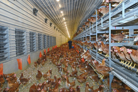 在雞舍集蛋臺前檢驗雞蛋。