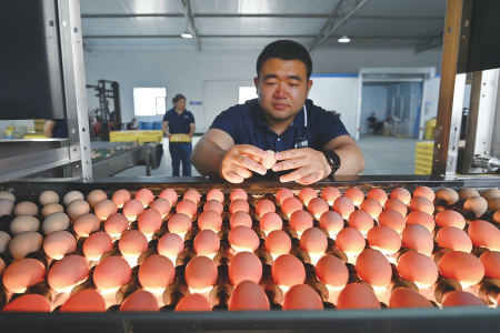 雞蛋通過自動分級機流向預先設定規(guī)格標準的生產(chǎn)線,工作人員再將大小一致的雞蛋收集碼盤。