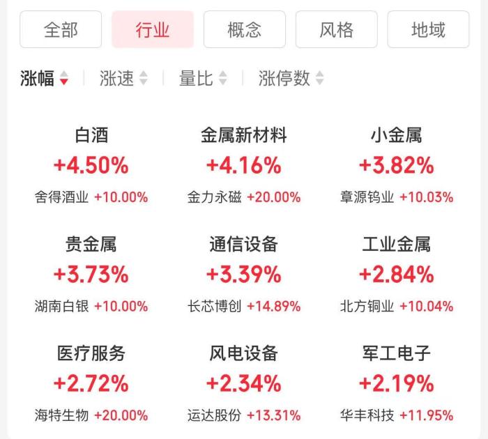 盤面上,白酒、金屬新材料、通信設備等行業(yè)板塊漲幅居前。概念板塊方面,稀土永磁概念大漲,帶動金力永磁、中鋼天源、領(lǐng)益智造等相關(guān)個股漲停;另,F(xiàn)5G概念、金屬鉛等表現(xiàn)亮眼。