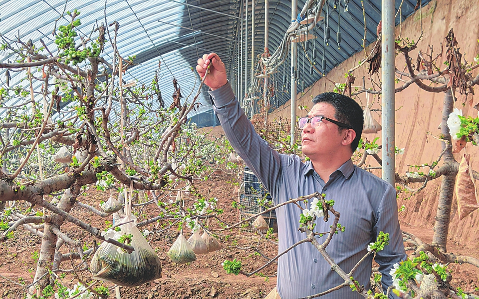 婁淵斌正在檢查車(chē)?yán)遄訕?shù)開(kāi)花情況。本報(bào)記者暢雪攝