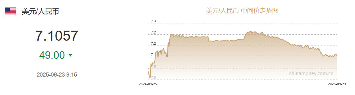 中新網(wǎng)9月23日電 據(jù)中國外匯交易中心網(wǎng)站消息,中國人民銀行授權(quán)中國外匯交易中心公布,2025年9月23日銀行間外匯市場人民幣匯率中間價(jià)為:1美元對人民幣7.1057元,上調(diào)49個(gè)基點(diǎn)。