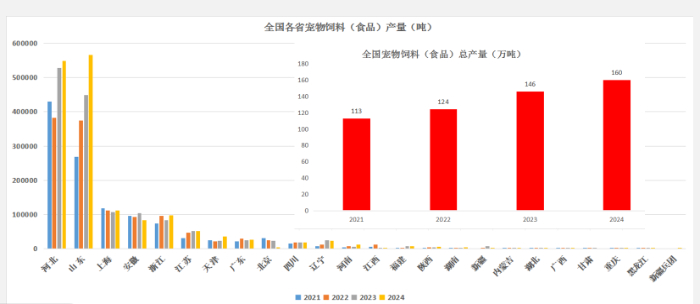 中國農(nóng)業(yè)科學院飼料研究所寵物營養(yǎng)團隊針對2021年至2024年全國各寵物飼料(食品)產(chǎn)量的分析(中國農(nóng)業(yè)科學院飼料研究所寵物營養(yǎng)團隊供圖)