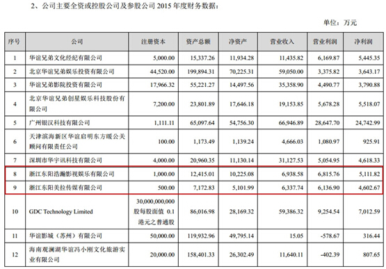 為何華誼兄弟在電影市場(chǎng)份額大跌的同時(shí)還能保持好看的營(yíng)業(yè)收入?原因就在2015年年末華誼兄弟大肆收購(gòu)的的三家影視公司,其中包括東陽(yáng)浩瀚以及馮小剛的美拉傳媒。這兩家公司2015年由于并表給華誼兄弟帶來了總計(jì)1.33億的收入以及0.97億的利潤(rùn)。