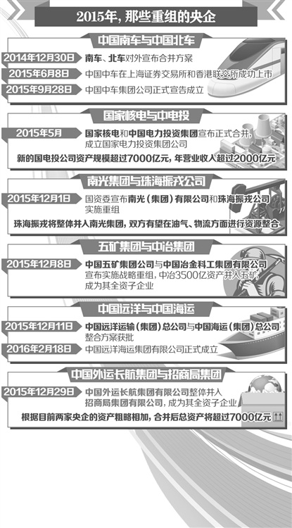 2015年,央業(yè)重組邁出重要步伐。有6對(duì)12家企業(yè)完成了重組,涉及至少27家上市公司,一批包括裝備制造、能源、航運(yùn)在內(nèi)的央企實(shí)現(xiàn)兼并重組,中央企業(yè)也由112家減至106家。2016年以來(lái),繼1月25日中材集團(tuán)與中建集團(tuán)發(fā)布公告稱實(shí)施戰(zhàn)略重組之后,中國(guó)國(guó)旅集團(tuán)與中國(guó)港中旅集團(tuán)也發(fā)布公告稱籌劃戰(zhàn)略重組。此外,中航動(dòng)力、成發(fā)科技、中航動(dòng)控三家公司則于日前發(fā)布重組公告。離國(guó)務(wù)院國(guó)資委直接監(jiān)管的中央企業(yè)數(shù)量減至100家僅有“一步之遙”。
