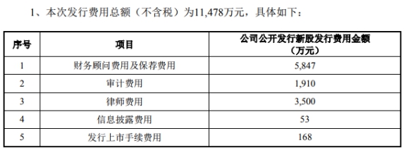 本次發(fā)行費(fèi)用(不含稅)共計(jì)1.15億元,其中中信證券、招商證券作為保薦機(jī)構(gòu)獲得保薦、承銷費(fèi)用5847萬(wàn)元。