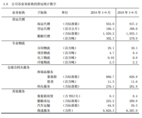 從公司各業(yè)務(wù)板塊運(yùn)營(yíng)情況來(lái)看,2019年1-9月,中國(guó)外運(yùn)各版塊業(yè)務(wù)量同比增幅較小,其中不乏較上年同比下降的情況。例如,貨運(yùn)代理中的空運(yùn)代理、專業(yè)物流中的合同物流、項(xiàng)目物流,倉(cāng)儲(chǔ)及碼頭服務(wù)中的庫(kù)場(chǎng)站服務(wù)散貨、碼頭服務(wù)等具體業(yè)務(wù)的貨運(yùn)量較2018年同期相比均有所下降。