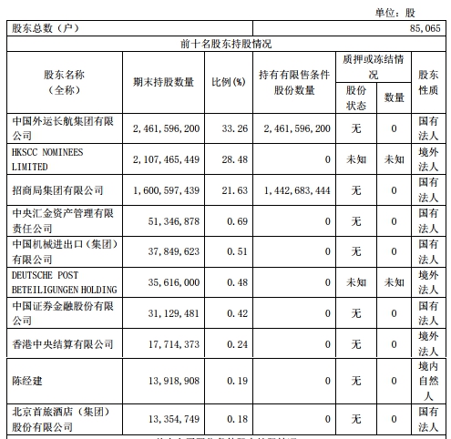 10月30日,中國(guó)外運(yùn)發(fā)布第三季度報(bào)告。截至2019年9月30日,中國(guó)外運(yùn)前三名股東持股情況為:中國(guó)外運(yùn)長(zhǎng)航集團(tuán)有限公司持有24.62億股,持股比例33.26%;HKSCC NOMINEES LIMITED持有21.07億股,持股比例28.48%;招商局集團(tuán)持有16.01億股,持股比例21.63%。