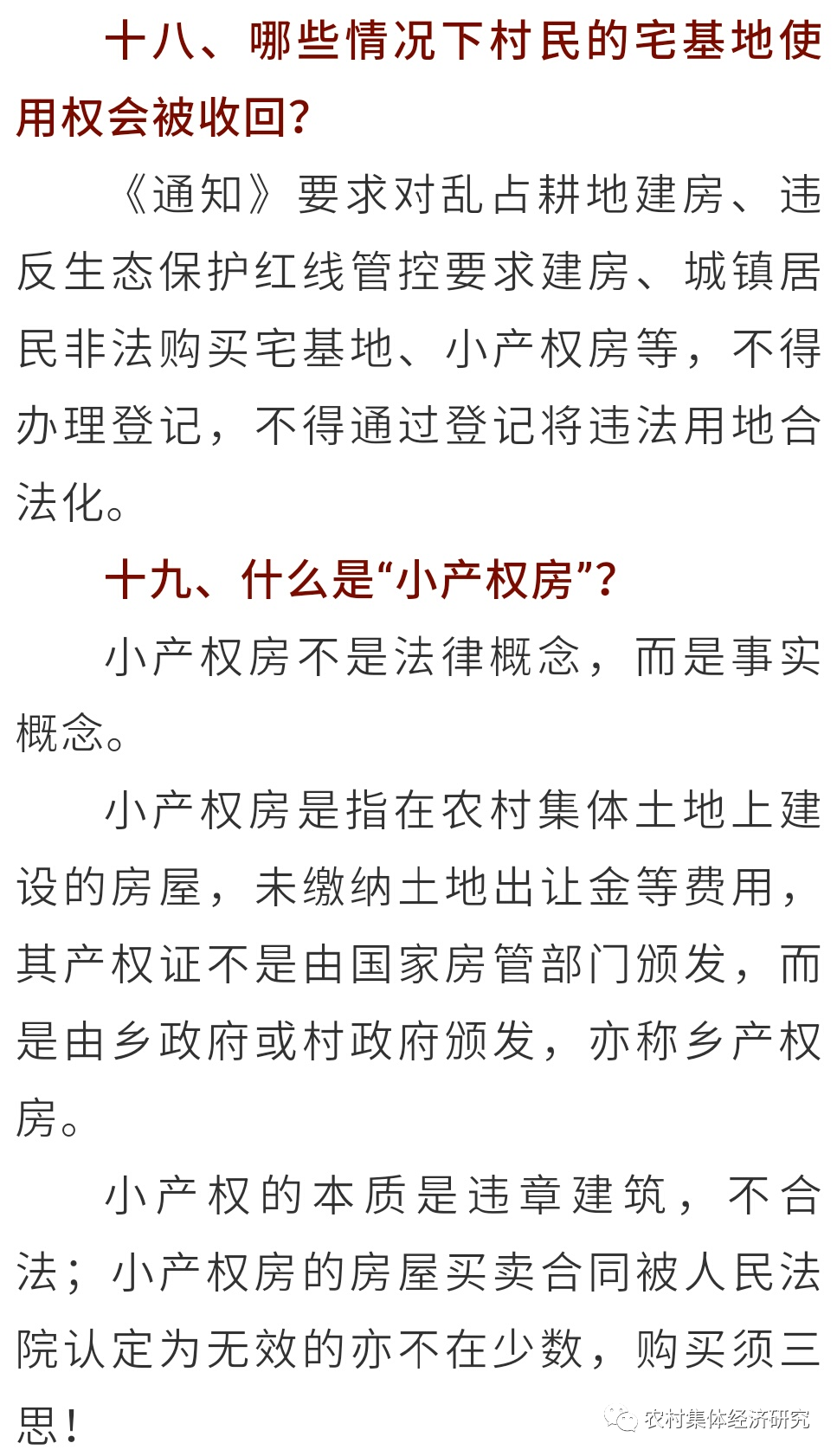 二十、城鎮(zhèn)居民能否到農(nóng)村購置宅基地?不能,《通知》要求,嚴禁城鎮(zhèn)居民到農(nóng)村購買宅基地,嚴禁下鄉(xiāng)利用宅基地建設(shè)別墅大院和私人會館,嚴禁借流轉(zhuǎn)之名違法違規(guī)圈占、買賣宅基地。