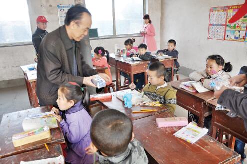 石建華在各所鄉(xiāng)村學校發(fā)放助學物資