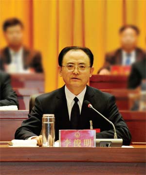 省人大常委會(huì)副主任、市委書記李俊明在市四屆人大四次會(huì)議閉幕大會(huì)上作重要講話。本報(bào)記者 劉紀(jì)森 攝