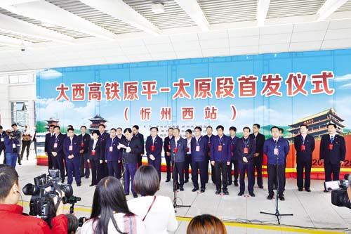 圖為大西高鐵原平至太原段首發(fā)儀式在忻州西站舉行,省人大常委會(huì)副主任、市委書(shū)記李俊明宣布高鐵開(kāi)通并發(fā)出發(fā)車指令。本報(bào)記者 宮愛(ài)文 攝