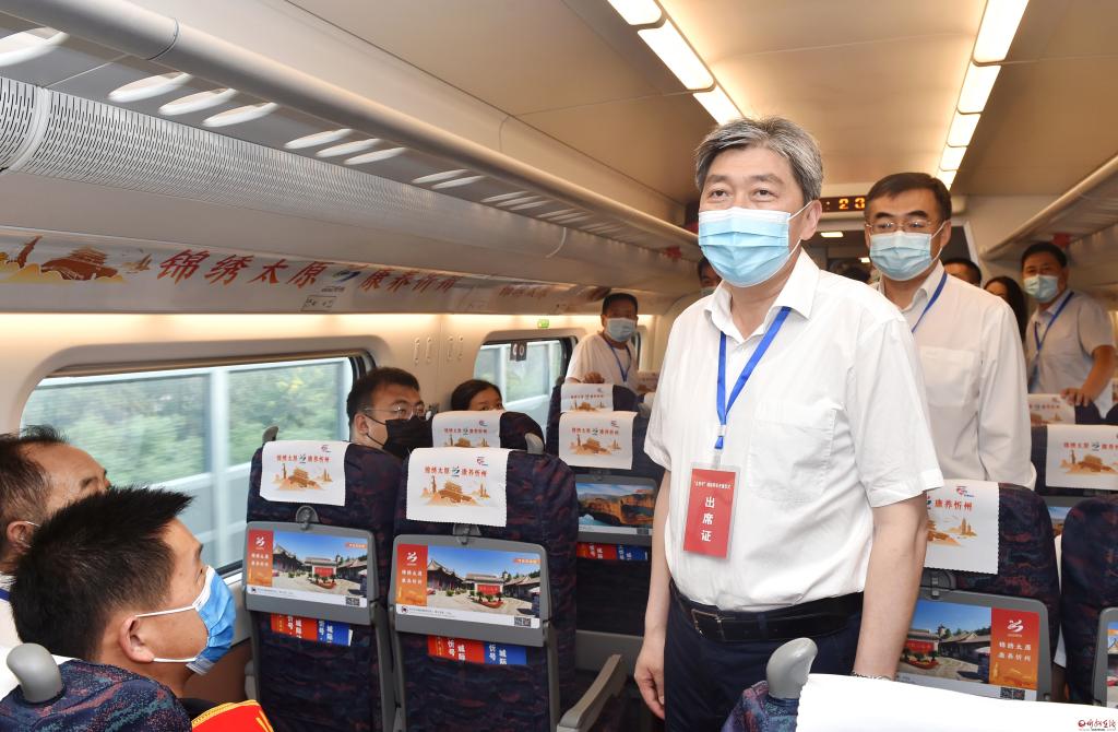 儀式結(jié)束后,朱曉東、李建國等一行共同乘坐以“錦繡太原·康養(yǎng)忻州”為主題包裝打造、冠名“太忻號”的D5306次動車組列車返回忻州。