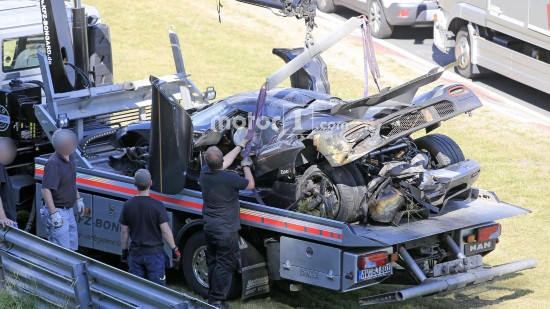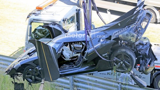 科尼塞克早上發(fā)布消息稱One:1打算在紐北刷新最快圈速紀(jì)錄。知情人表示,刷圈過程中,車輛在高速駛?cè)階denauer Forst彎時(shí)發(fā)生失控,車身撞跨賽道左側(cè)的護(hù)欄,進(jìn)而飛入草地,事故令One:1車身?yè)p毀嚴(yán)重,前保險(xiǎn)杠折斷、擋風(fēng)玻璃破碎,尾部受損。
