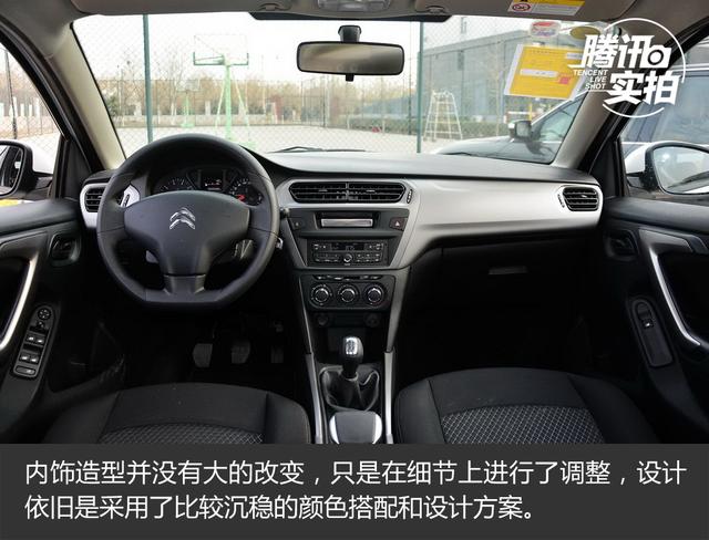 內(nèi)飾造型并沒(méi)有大的改變,只是在細(xì)節(jié)上進(jìn)行了調(diào)整,設(shè)計(jì)依舊是采用了比較沉穩(wěn)的顏色搭配和設(shè)計(jì)方案。中控臺(tái)的材質(zhì)還是硬塑料,做工和顏色搭配還算不錯(cuò),畢竟它是一臺(tái)雪鐵龍的入門(mén)級(jí)車(chē)型。三幅平底方向盤(pán)造型看著令人很有好感,而且手感也不錯(cuò),支持上下兩向調(diào)節(jié),并不能前后拉伸。指針式儀表盤(pán)黑底白字清晰易讀,表盤(pán)上新增了雪鐵龍法文LOGO和三叉星式圖案,上方顯示屏的顏色也從紅色變?yōu)榱税咨?。多媒體系統(tǒng)功能比較單一,可以提供收音機(jī)和通過(guò)底部USB接駁外部音源。