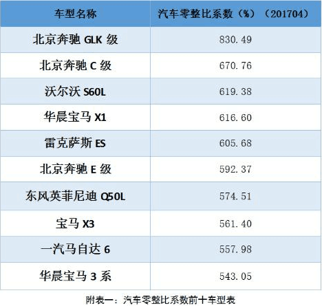 所謂 “ 零整比系數(shù) ” ,就是車輛配件價(jià)格總和與整車銷售價(jià)格的比值,可以直觀反映不同車型維修成本的差異,即在整車價(jià)格一定的前提下,零整比系數(shù)高的車型,意味著維修成本較高,反之則表明該車型維修成本較低。