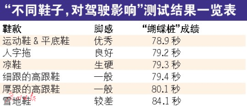 今年4月26日,北京朝陽區(qū)華貿(mào)中心地庫發(fā)生一起交通事故,一輛SUV沖破墻壁,沖進地下車庫的辦公室。據(jù)目擊者稱,駕駛員是一位女司機。事故發(fā)生時,穿著一雙高跟鞋。而在去年,江蘇常州發(fā)生一起交通事故,一輛白色轎車將另外一輛車撞到側(cè)翻,駕駛白色轎車同樣的是一位女司機,事故發(fā)生時,穿著一雙清爽的涼鞋。 夏季到來,不少偷懶的女司機穿著涼爽簡單的人字拖開車。同樣,顏色靚麗款式多樣的高跟鞋成為部分愛美女士的必備品。然而,網(wǎng)上流傳著“穿高跟鞋開車等于謀殺,穿拖鞋開車等于自殺”,穿著拖鞋和高跟鞋會對開車產(chǎn)生致命性的影響?危害到底有多大?非常測試決定實地測試一下。 【測試目的】 高跟鞋的高跟、拖鞋和涼鞋的不貼腳,常常被認(rèn)為是女司機發(fā)生交通事故的罪魁禍?zhǔn)?。然而,在《新交?guī)罰款細(xì)則表》中,并沒有對駕駛員所穿的鞋有什么處罰條款。拖鞋和高跟鞋,真會影響駕駛,還是被冤枉的“背鍋俠”,是該有一個準(zhǔn)確的答案了。此次非常測試,目的在于找出不同鞋子,對駕駛的影響。 【測試方法】 車天下君找來多雙款式不同的鞋,包括拖鞋、高跟鞋、運動鞋、高幫鞋。為最大程度避免誤差,拖鞋還分普通拖鞋和人字拖,高跟鞋還分細(xì)跟和厚跟。讓測試人員一一穿上這些鞋子,進行相關(guān)的測試,通過測試數(shù)據(jù),比較分析得出結(jié)果。 為讓測試更加接近于真相,此次測試專門請來一位女士參與。她穿上不同的鞋子駕駛同樣一輛汽車。測試項目分兩種,一是直觀感受,駕駛員描述不同鞋子對駕駛習(xí)慣的影響;二是讓數(shù)據(jù)說話,穿上不同的鞋子挑戰(zhàn)經(jīng)典的場地測試項目“蝴蝶樁”,看所耗時間的多與少。 有必要介紹一下參與測試的馬女士。這是一位老司機,擁有15年駕齡,累積行駛里程超過10萬公里,經(jīng)歷過多場汽車駕駛培訓(xùn)和業(yè)余汽車比賽。駕駛風(fēng)格是穩(wěn)健,跑相同的賽道,成績波動不超過1秒。 運動鞋腳感最好 最差是雪地鞋 車天下君讓馬女士帶來她常穿的鞋。 首先上場的是運動鞋,這是從駕校教練到警察蜀黍們都認(rèn)可的駕駛時穿的鞋子。馬女士介紹,穿著運動鞋踩踏板的感覺最好,反饋力度適中,輕便,靈活。 測試項目“蝴蝶樁”由九個樁桶組成,要取得好成績,必須反復(fù)的剎車和加速,并需要緊急變線,駕駛員的腳要在剎車和油門踏板之間反復(fù)切換。 穿著運動鞋,馬女士反復(fù)挑戰(zhàn)“蝴蝶樁”,第一次是82.3秒,第二次是81.3秒,第三次是78.9秒。78.9秒是她穿著最合適駕駛的運動鞋能夠取得的最好成績,同時也成為其他鞋子參考的標(biāo)準(zhǔn)。 第二次測試的是拖鞋,又分普通人字拖和涼鞋。人字拖的鞋底稍厚,涼鞋的底子則偏薄。馬女士表示,人字拖的腳感與普通運動鞋接近,沒有什么不妥。反倒是涼鞋的腳感較為生硬,踏板的反饋力幾乎沒有什么過濾,直接反饋到腳底,與穿運動鞋的腳感完全不同,更接近于光腳。 先后穿上兩種涼鞋挑戰(zhàn)“蝴蝶樁”?!叭俗滞稀表樌瓿扇翁魬?zhàn),中間沒有出任何錯誤。在激烈駕駛中,人字拖不打滑,最好成績是79.2秒?!皼鲂钡谝淮翁魬?zhàn)便撞上雪糕筒,但馬女士表示,涼鞋鞋跟太薄,開車時腳感怪異,需要習(xí)慣。 緊接著的是高跟鞋,分細(xì)跟和厚跟,鞋跟高度在5厘米左右。腳感方面,馬女士表示,高跟鞋的腳感和運動鞋沒有不同,不同之處在于駕駛姿勢,穿著高跟鞋等于“踮著腳”在開車:穿“運動鞋”開車,是腳的前掌和中掌發(fā)力。穿著“高跟鞋”開車,就只有腳的前掌發(fā)力。對于“穿高跟鞋開車,對踏板切換有幫助能縮短時間”的說法,馬女士表示完全沒有感覺。 最后是“雪地鞋”。由于需要保暖,雪地鞋都是高幫設(shè)計,鞋底厚。雪地鞋是所有鞋子里面腳感最差的,踏板反饋力被過濾得七七八八,穿著它開車像是踩在海綿上?!把┑匦钡某煽円彩撬行永锩孀畈畹?,84.1秒。 測試分析 穿不同鞋子對司機駕駛確實有影響 穿高跟鞋開車等于謀殺?經(jīng)過本次測試體驗,我們發(fā)現(xiàn)當(dāng)高跟鞋的鞋跟高度在5厘米以下對司機駕駛模式幾乎沒有任何影響。但如果穿的是“恨天高”款,那就肯定是非常危險的。 在夏天,拖鞋和涼鞋不推薦司機駕駛時穿,但我們測試的結(jié)果是,它們對于駕駛有影響,但影響并不大。需要說明一點,拖鞋和涼鞋最讓人擔(dān)心之處在于打滑,而此次測試時,我們測試了整整一個下午,都沒有出現(xiàn)拖鞋打滑的情況。我們大膽地猜測,打滑是因為拖鞋的尺碼不多,可能偏大。只要鞋碼合適,拖鞋也是不容易打滑的。 成績最差居然是“雪地鞋”,這是我們一開始沒有想到的。為再次求證,馬女士測試完之后,車天下君也穿著厚底靴子上場測試。同樣的“蝴蝶樁”,同樣的線路,成績慢了2.2秒。為什么“雪地鞋”成績最差?因為鞋底厚,減震效果好,人需要更長的時間來操作剎車和油門踏板,導(dǎo)致剎車和加速系統(tǒng)不能完全發(fā)揮作用。 測試結(jié)論 穿平底鞋和運動鞋開車,仍然是最安全的,因為這會給駕駛員最大的信心和底氣,而信心和底氣能直接影響駕駛的狀態(tài)。駕駛發(fā)生交通事故更多原因不在于鞋而在于人,是駕駛不熟練或者開車注意力不集中。測試結(jié)果顯示,穿著厚底的雪地鞋開車反而是最危險的,這也就不