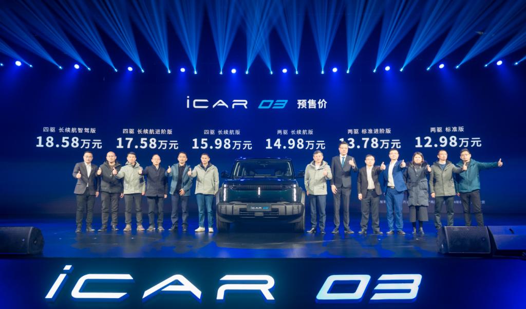 12月18日,“iCAR 03全球預(yù)售發(fā)布暨iCAR零碳智慧工廠開放日”在安徽蕪湖舉行,其中iCAR 03開啟預(yù)售,新車擁有兩驅(qū)和四驅(qū)共6個(gè)版型,提供6種外觀車色和2款內(nèi)飾配色選擇,官方預(yù)售價(jià)12.98萬元起。