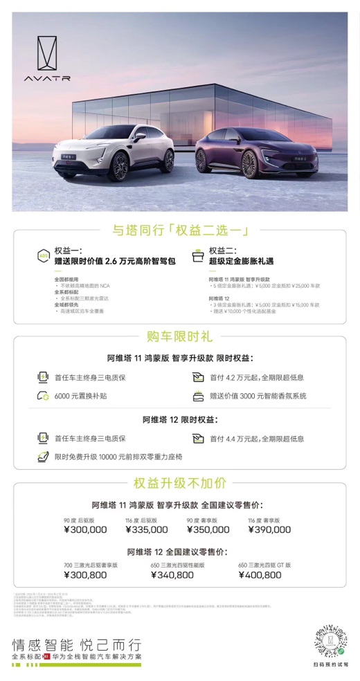 華為iTRACK上車,實(shí)現(xiàn)超凡駕乘體驗(yàn) 基于兩大核心技術(shù),華為iTRACK功能能夠“讓路途皆坦途”。針對日常生活中最為常見的減速帶場景,華為iTRACK準(zhǔn)確識別車輪輪速波動,毫秒內(nèi)對扭矩進(jìn)行調(diào)節(jié)控制,實(shí)現(xiàn)快速收斂。經(jīng)過實(shí)測,輪速波動可減少50%,余震時間可縮短40%,從而有效提升整車駕乘的舒適感和安全性,為用戶帶來超凡駕乘體驗(yàn)。 高階智駕包0元享 針對本次上市,2024年1月8日至2月29日期間,阿維塔科技推出了豐厚的購車禮遇,用戶可在權(quán)益一與權(quán)益二中擇一享受。 權(quán)益一,1月8日后購車的用戶贈送限時價值26,000元高階智駕包,以不依賴高精地圖的NCA帶來全域都領(lǐng)先的高速城區(qū)泊車全覆蓋體驗(yàn)。權(quán)益二,活動期間購車用戶可享5倍定金膨脹禮遇,5000定金抵扣25,000元車款,車價立減兩萬元。與此同時,阿維塔推出更多貼心限時權(quán)益:首任車主終身三電質(zhì)保,6000元置換補(bǔ)貼即刻擁有;另外,全系車主可享智能香氛系統(tǒng)贈送,并擁有首付4.2萬元起、全期限超低息的購車金融權(quán)益。與此同時,阿維塔 11 鴻蒙版智享升級款全國零售價30萬- 39萬元,真正做到產(chǎn)品升級不加價。
