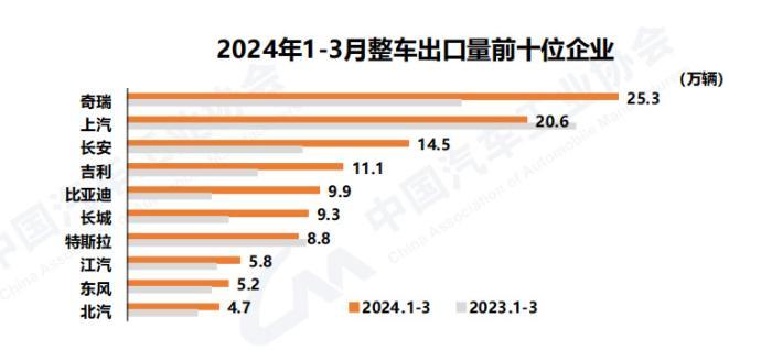 2024年一季度汽車出口數(shù)據(jù)。數(shù)據(jù)來源:中國汽車工業(yè)協(xié)會(huì)