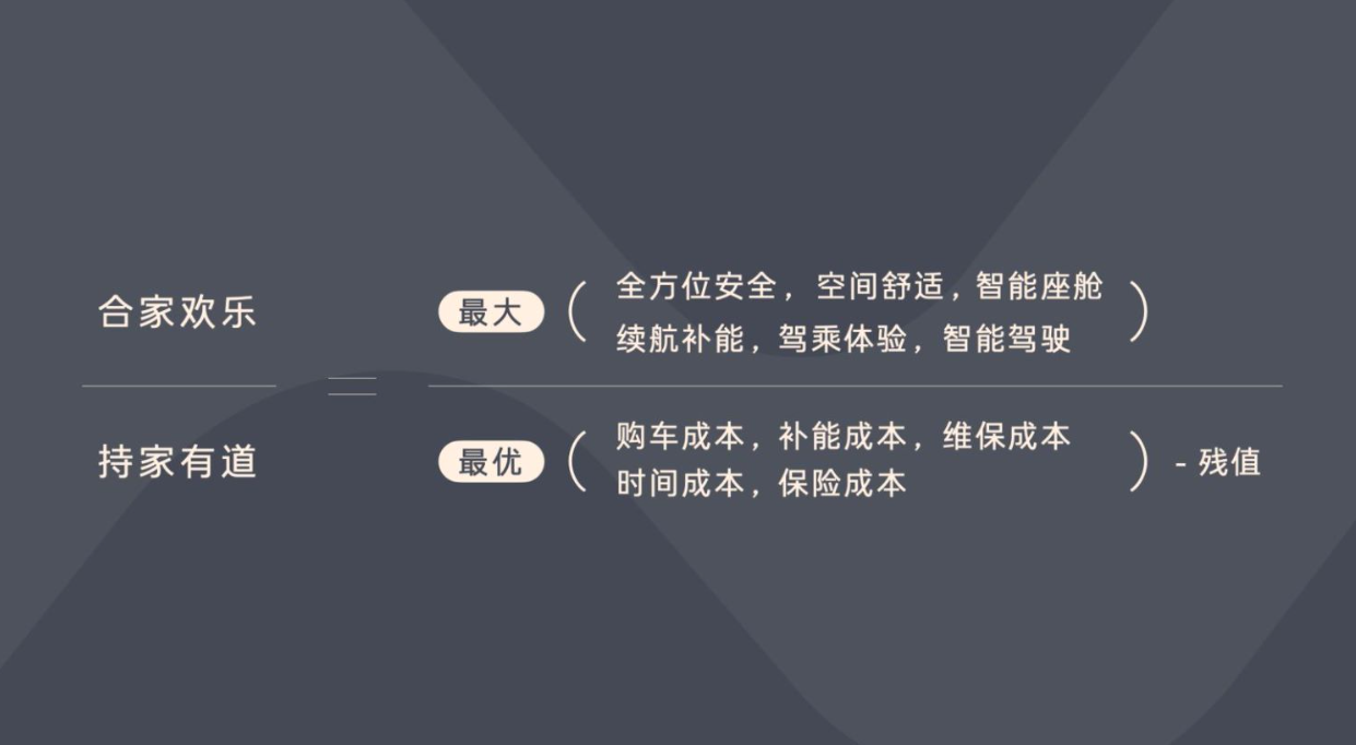 另一點專注放在用戶的核心需求上,這需要產(chǎn)品呈現(xiàn)——話筒交給了他,他用了一個家庭用車價值公式,將產(chǎn)品作為一個分數(shù),其中分子體驗價值的最大化,分母是擁車成本的最優(yōu)化。