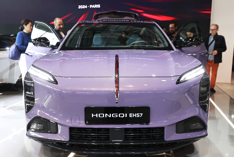 10月14日,人們?cè)诜▏?guó)巴黎凡爾賽門展覽中心舉行的2024巴黎車展媒體開放日上參觀紅旗展臺(tái)。新華社記者 高靜 攝