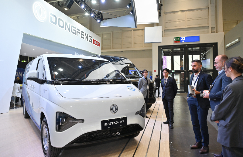 (資料圖片)2024年9月16日,在德國漢諾威國際交通運輸博覽會媒體預展上,人們在東風汽車展區(qū)參觀E-STAR V7商用車。新華社記者 任鵬飛 攝